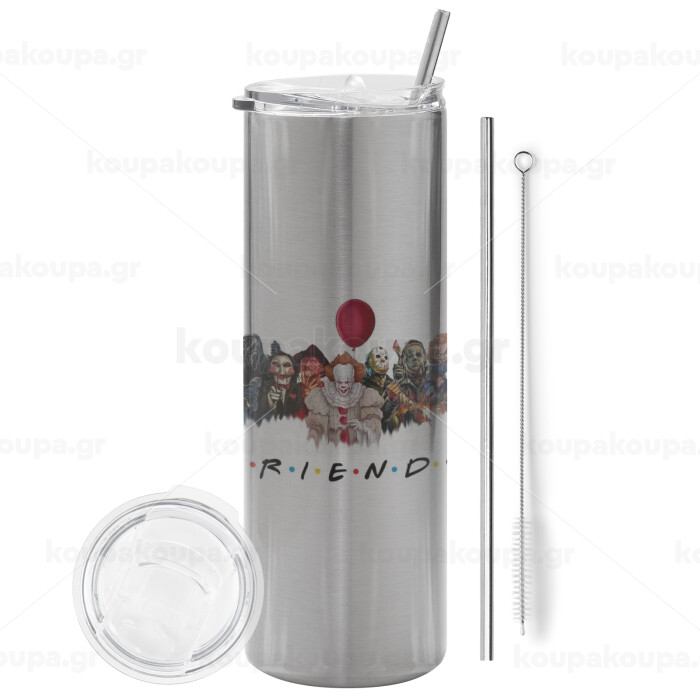 Halloween Friends, Tumbler ποτήρι θερμό Ασημένιο από ανοξείδωτο ατσάλι 600ml, με μεταλλικό καλαμάκι & βούρτσα καθαρισμού