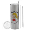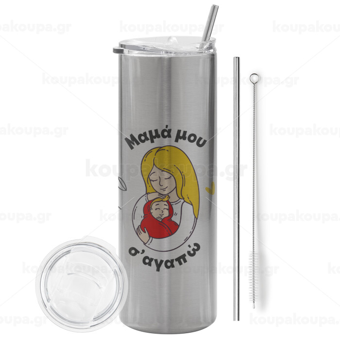 Μανούλα σ'αγαπώ αγκαλιά!, Tumbler ποτήρι θερμό Ασημένιο από ανοξείδωτο ατσάλι 600ml, με μεταλλικό καλαμάκι & βούρτσα καθαρισμού