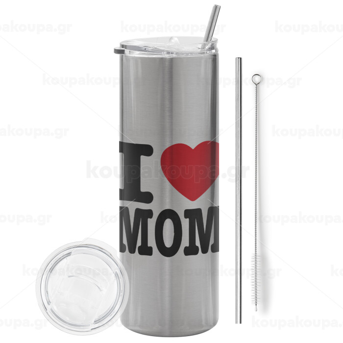 I LOVE MOM, Tumbler ποτήρι θερμό Ασημένιο από ανοξείδωτο ατσάλι 600ml, με μεταλλικό καλαμάκι & βούρτσα καθαρισμού