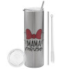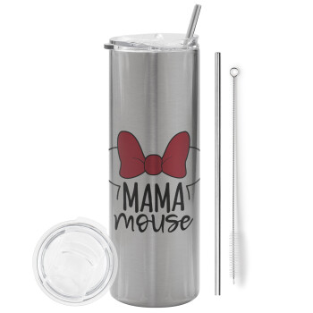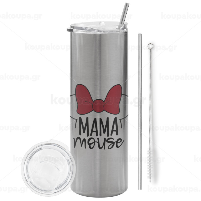 MAMA mouse, Tumbler ποτήρι θερμό Ασημένιο από ανοξείδωτο ατσάλι 600ml, με μεταλλικό καλαμάκι & βούρτσα καθαρισμού