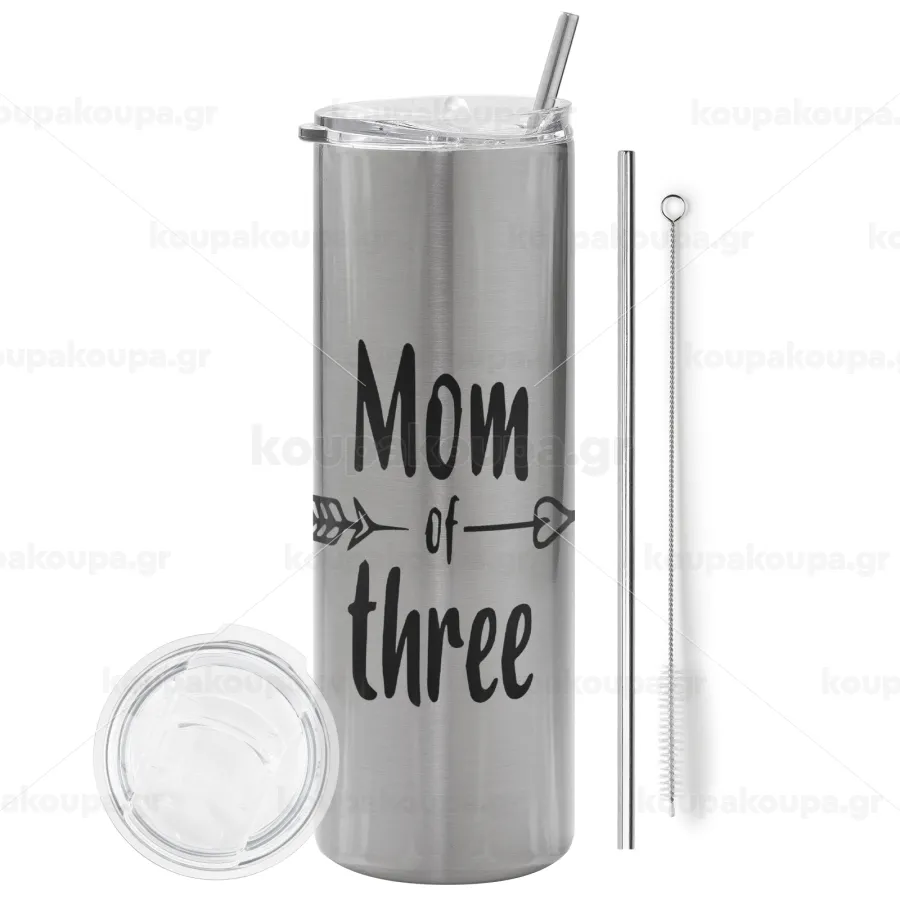Mom of three, Tumbler ποτήρι θερμό Ασημένιο από ανοξείδωτο ατσάλι 600ml, με μεταλλικό καλαμάκι & βούρτσα καθαρισμού