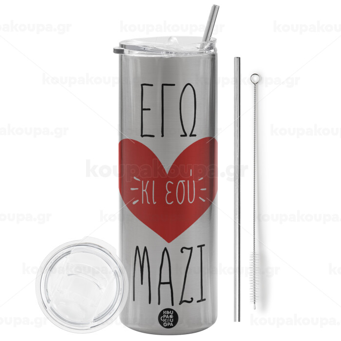 Εγώ κι εσύ μαζί!, Tumbler ποτήρι θερμό Ασημένιο από ανοξείδωτο ατσάλι 600ml, με μεταλλικό καλαμάκι & βούρτσα καθαρισμού