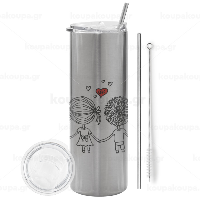 Hold my hand for ever, Tumbler ποτήρι θερμό Ασημένιο από ανοξείδωτο ατσάλι 600ml, με μεταλλικό καλαμάκι & βούρτσα καθαρισμού
