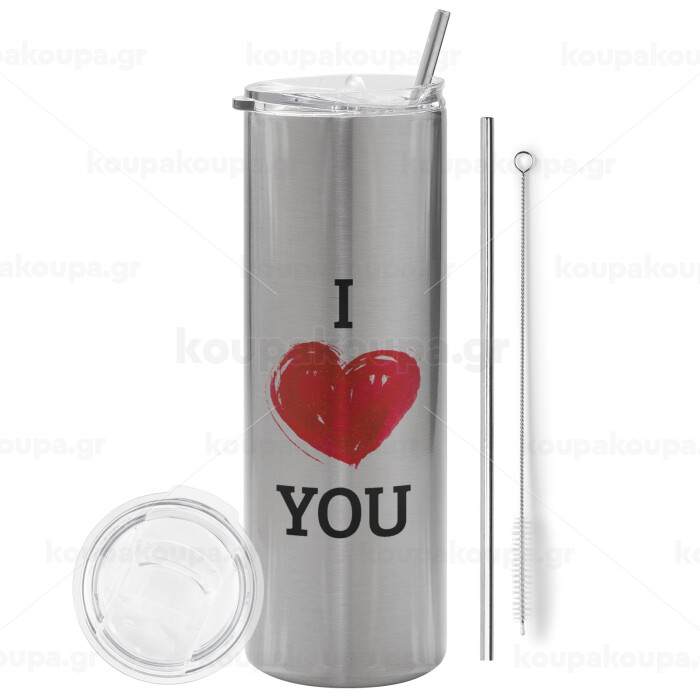 I Love You, Tumbler ποτήρι θερμό Ασημένιο από ανοξείδωτο ατσάλι 600ml, με μεταλλικό καλαμάκι & βούρτσα καθαρισμού