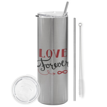 Love forever ∞, Tumbler ποτήρι θερμό Ασημένιο από ανοξείδωτο ατσάλι 600ml, με μεταλλικό καλαμάκι & βούρτσα καθαρισμού