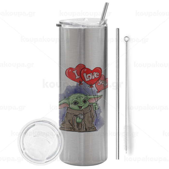 Yoda, i love you, Tumbler ποτήρι θερμό Ασημένιο από ανοξείδωτο ατσάλι 600ml, με μεταλλικό καλαμάκι & βούρτσα καθαρισμού