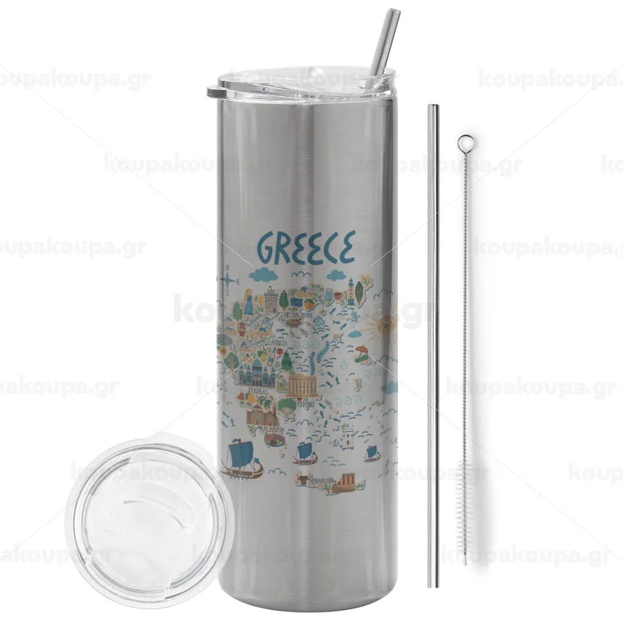 Χάρτης Ελλάδος, Tumbler ποτήρι θερμό Ασημένιο από ανοξείδωτο ατσάλι 600ml, με μεταλλικό καλαμάκι & βούρτσα καθαρισμού