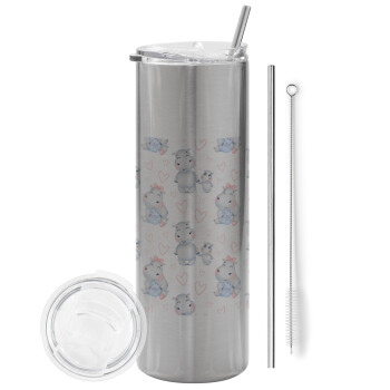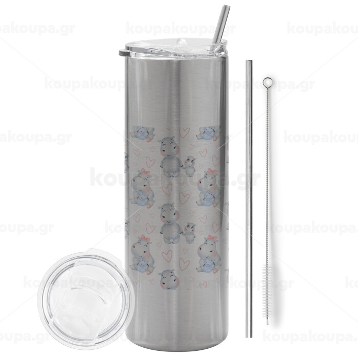 Ιπποπόταμος, Tumbler ποτήρι θερμό Ασημένιο από ανοξείδωτο ατσάλι 600ml, με μεταλλικό καλαμάκι & βούρτσα καθαρισμού