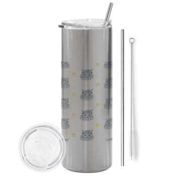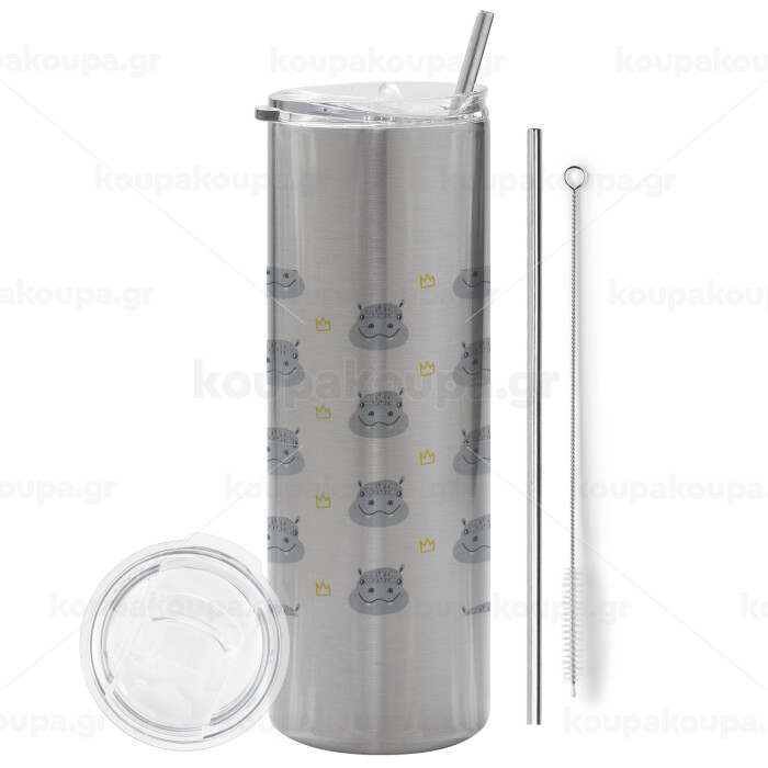 Hippo, Tumbler ποτήρι θερμό Ασημένιο από ανοξείδωτο ατσάλι 600ml, με μεταλλικό καλαμάκι & βούρτσα καθαρισμού