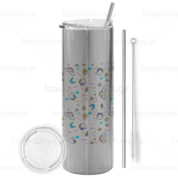 Unicorn pattern white, Tumbler ποτήρι θερμό Ασημένιο από ανοξείδωτο ατσάλι 600ml, με μεταλλικό καλαμάκι & βούρτσα καθαρισμού