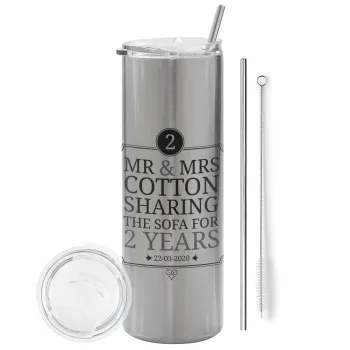 Mr & Mrs Sharing the sofa, Tumbler ποτήρι θερμό Ασημένιο από ανοξείδωτο ατσάλι 600ml, με μεταλλικό καλαμάκι & βούρτσα καθαρισμού