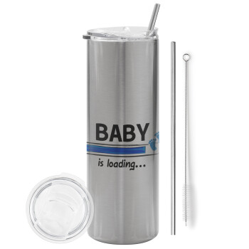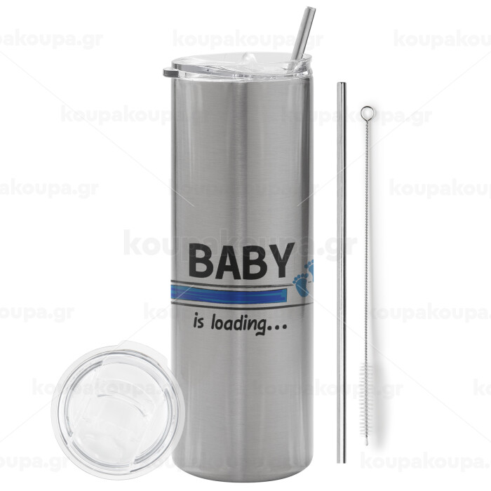 Baby is Loading BOY, Tumbler ποτήρι θερμό Ασημένιο από ανοξείδωτο ατσάλι 600ml, με μεταλλικό καλαμάκι & βούρτσα καθαρισμού
