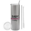 Baby is Loading GIRL, Tumbler ποτήρι θερμό Ασημένιο από ανοξείδωτο ατσάλι 600ml, με μεταλλικό καλαμάκι & βούρτσα καθαρισμού