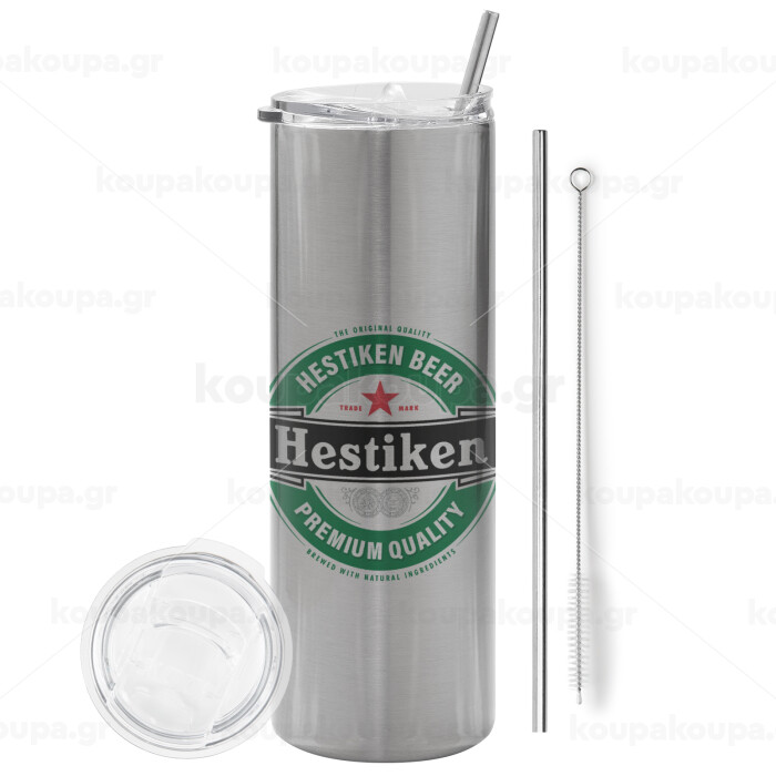 Hestiken Beer, Tumbler ποτήρι θερμό Ασημένιο από ανοξείδωτο ατσάλι 600ml, με μεταλλικό καλαμάκι & βούρτσα καθαρισμού