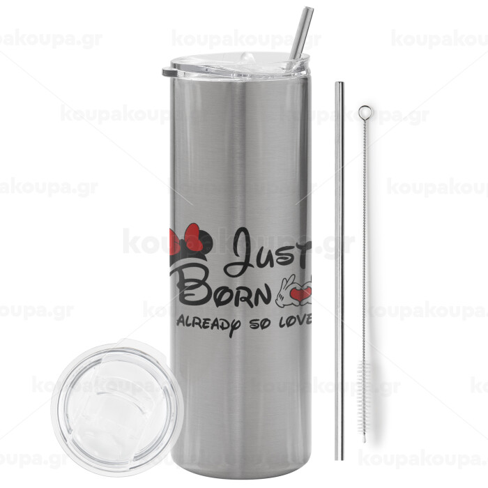 Just born already so loved, Tumbler ποτήρι θερμό Ασημένιο από ανοξείδωτο ατσάλι 600ml, με μεταλλικό καλαμάκι & βούρτσα καθαρισμού