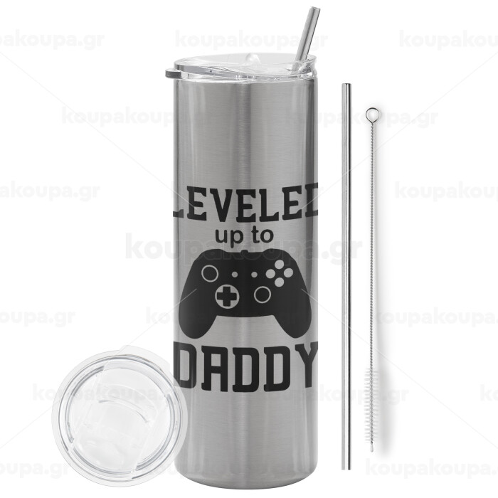 Leveled to Daddy, Tumbler ποτήρι θερμό Ασημένιο από ανοξείδωτο ατσάλι 600ml, με μεταλλικό καλαμάκι & βούρτσα καθαρισμού