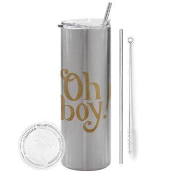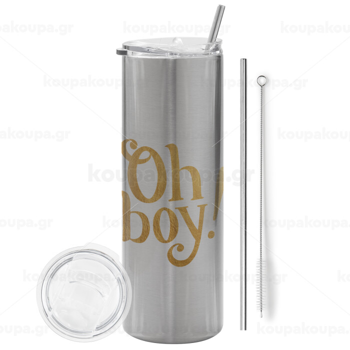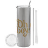 Oh baby gold, Tumbler ποτήρι θερμό Ασημένιο από ανοξείδωτο ατσάλι 600ml, με μεταλλικό καλαμάκι & βούρτσα καθαρισμού