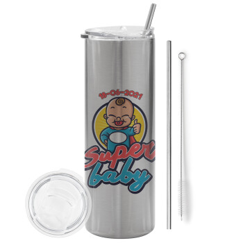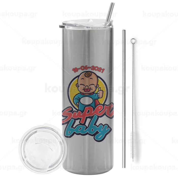 Super baby., Tumbler ποτήρι θερμό Ασημένιο από ανοξείδωτο ατσάλι 600ml, με μεταλλικό καλαμάκι & βούρτσα καθαρισμού