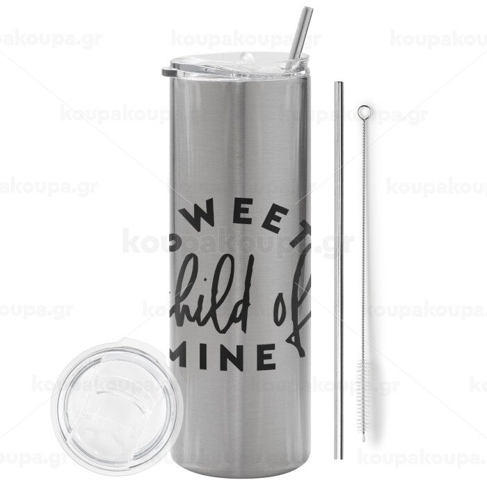 Sweet child of mine!, Tumbler ποτήρι θερμό Ασημένιο από ανοξείδωτο ατσάλι 600ml, με μεταλλικό καλαμάκι & βούρτσα καθαρισμού