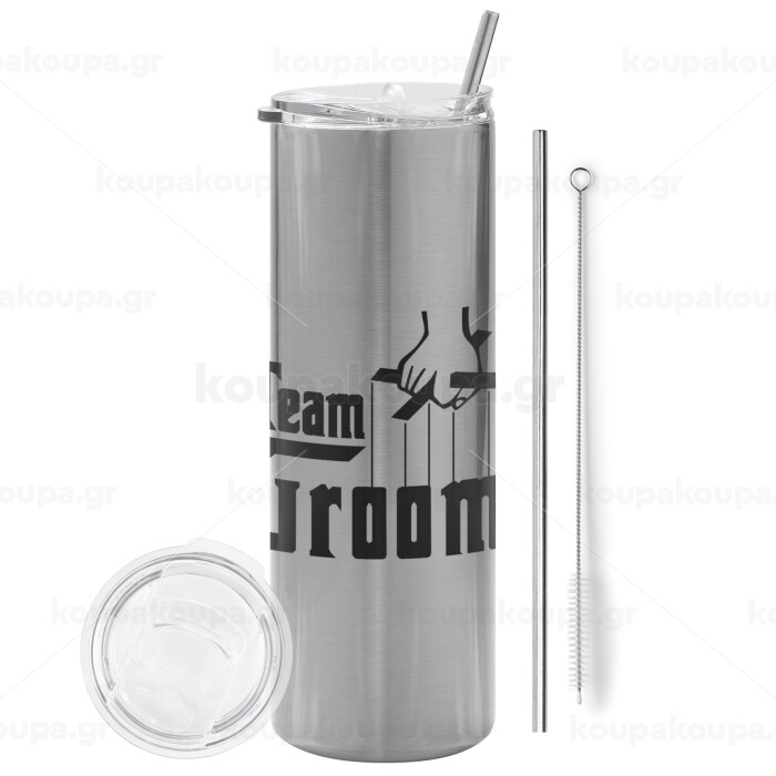 Team Groom, Tumbler ποτήρι θερμό Ασημένιο από ανοξείδωτο ατσάλι 600ml, με μεταλλικό καλαμάκι & βούρτσα καθαρισμού