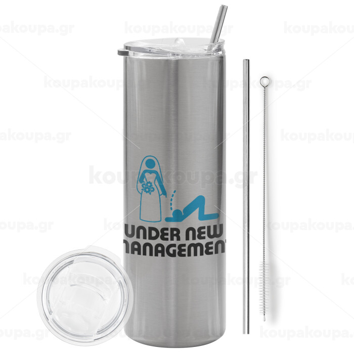 Under new Management, Tumbler ποτήρι θερμό Ασημένιο από ανοξείδωτο ατσάλι 600ml, με μεταλλικό καλαμάκι & βούρτσα καθαρισμού