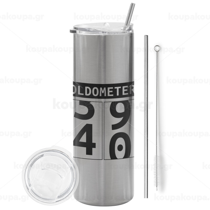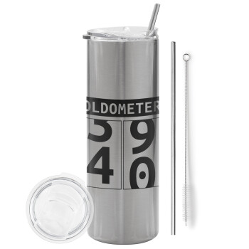 OLDOMETER, Tumbler ποτήρι θερμό Ασημένιο από ανοξείδωτο ατσάλι 600ml, με μεταλλικό καλαμάκι & βούρτσα καθαρισμού
