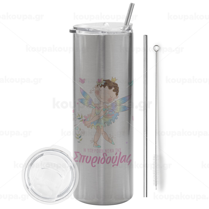 Η νονά μου, Νεράϊδα, Tumbler ποτήρι θερμό Ασημένιο από ανοξείδωτο ατσάλι 600ml, με μεταλλικό καλαμάκι & βούρτσα καθαρισμού