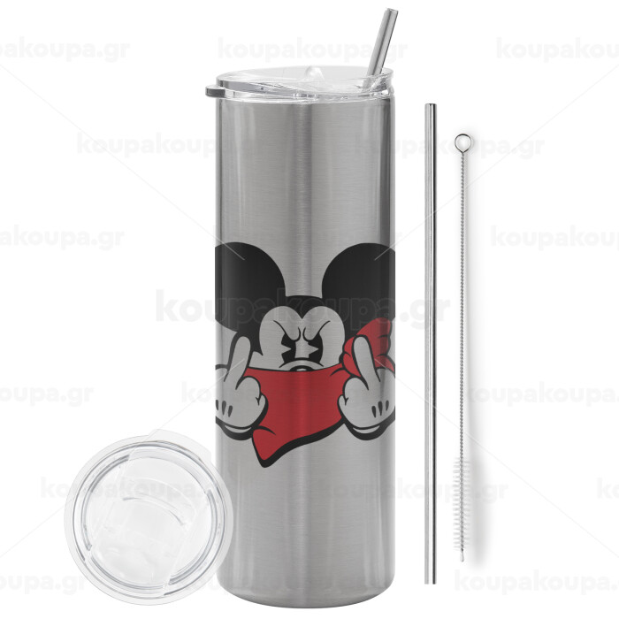 Mickey fuck off, Tumbler ποτήρι θερμό Ασημένιο από ανοξείδωτο ατσάλι 600ml, με μεταλλικό καλαμάκι & βούρτσα καθαρισμού
