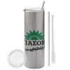 ΠΑΣΟΚ το ορθόδοξο, Tumbler ποτήρι θερμό Ασημένιο από ανοξείδωτο ατσάλι 600ml, με μεταλλικό καλαμάκι & βούρτσα καθαρισμού