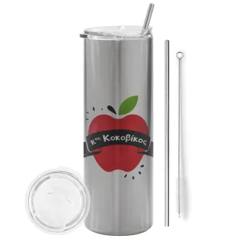 Αναμνηστικό Δώρο Δασκάλου Κόκκινο Μήλο, Tumbler ποτήρι θερμό Ασημένιο από ανοξείδωτο ατσάλι 600ml, με μεταλλικό καλαμάκι & βούρτσα καθαρισμού