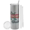 Best teacher in the World!, Tumbler ποτήρι θερμό Ασημένιο από ανοξείδωτο ατσάλι 600ml, με μεταλλικό καλαμάκι & βούρτσα καθαρισμού