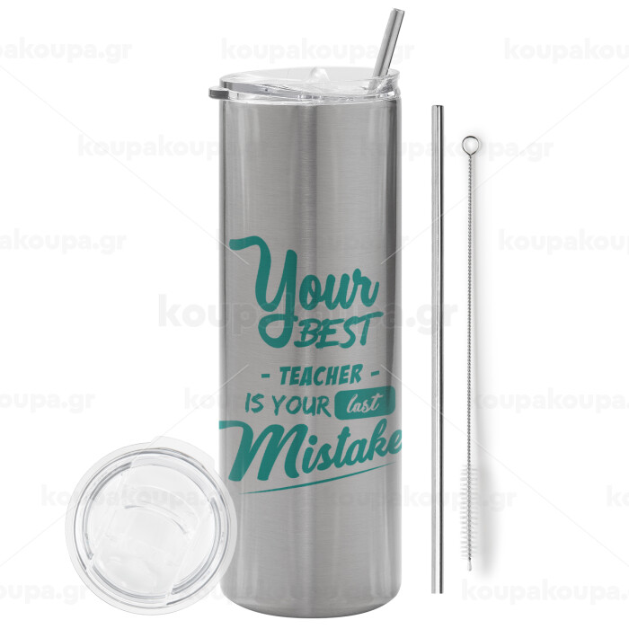 Your best teacher is your last mistake, Tumbler ποτήρι θερμό Ασημένιο από ανοξείδωτο ατσάλι 600ml, με μεταλλικό καλαμάκι & βούρτσα καθαρισμού