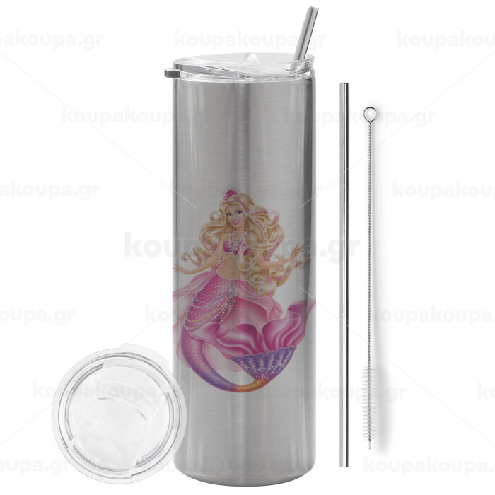 Barbie γοργόνα , Tumbler ποτήρι θερμό Ασημένιο από ανοξείδωτο ατσάλι 600ml, με μεταλλικό καλαμάκι & βούρτσα καθαρισμού