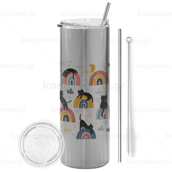 Γατούλες, Tumbler ποτήρι θερμό Ασημένιο από ανοξείδωτο ατσάλι 600ml, με μεταλλικό καλαμάκι & βούρτσα καθαρισμού