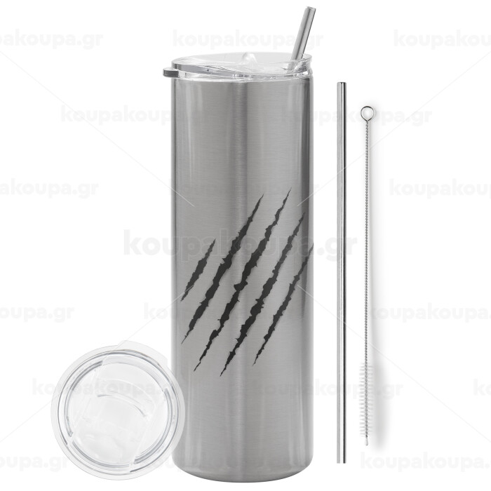 Claw scratch, Tumbler ποτήρι θερμό Ασημένιο από ανοξείδωτο ατσάλι 600ml, με μεταλλικό καλαμάκι & βούρτσα καθαρισμού