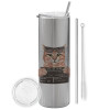 Cool cat, Tumbler ποτήρι θερμό Ασημένιο από ανοξείδωτο ατσάλι 600ml, με μεταλλικό καλαμάκι & βούρτσα καθαρισμού