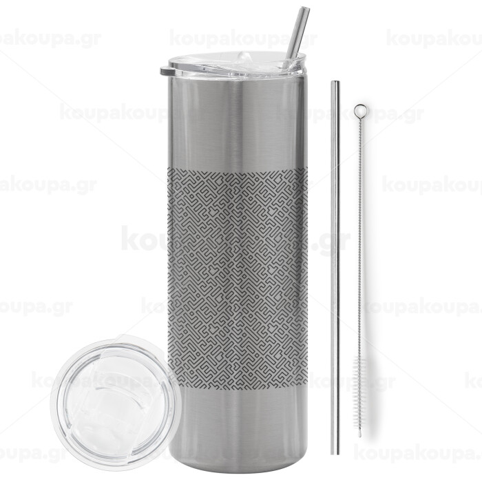 Doodle Maze, Tumbler ποτήρι θερμό Ασημένιο από ανοξείδωτο ατσάλι 600ml, με μεταλλικό καλαμάκι & βούρτσα καθαρισμού