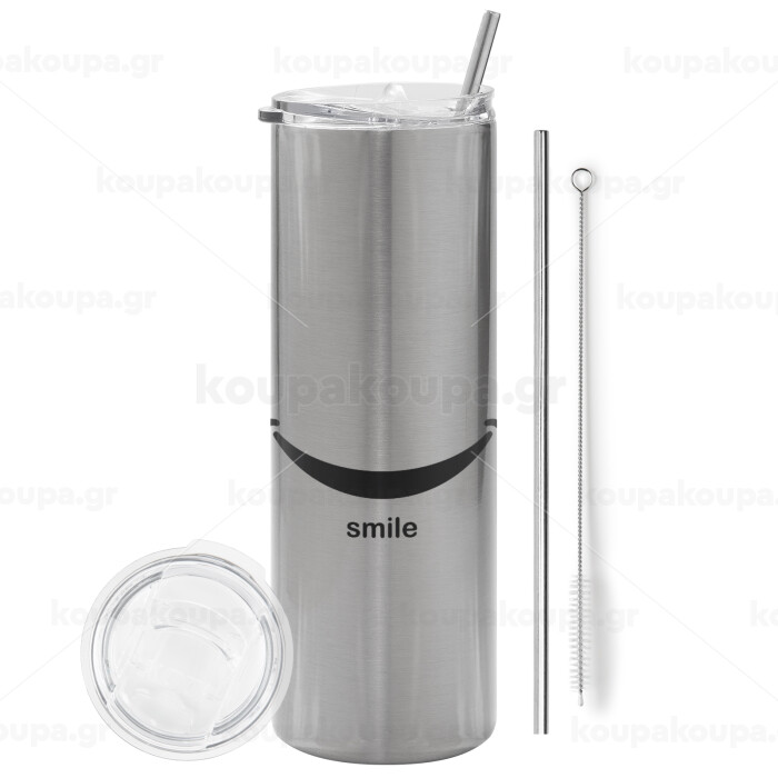 Smile!!!, Tumbler ποτήρι θερμό Ασημένιο από ανοξείδωτο ατσάλι 600ml, με μεταλλικό καλαμάκι & βούρτσα καθαρισμού