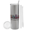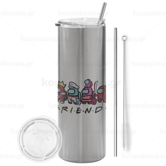Among US Friends, Tumbler ποτήρι θερμό Ασημένιο από ανοξείδωτο ατσάλι 600ml, με μεταλλικό καλαμάκι & βούρτσα καθαρισμού
