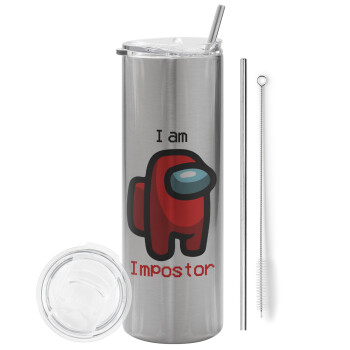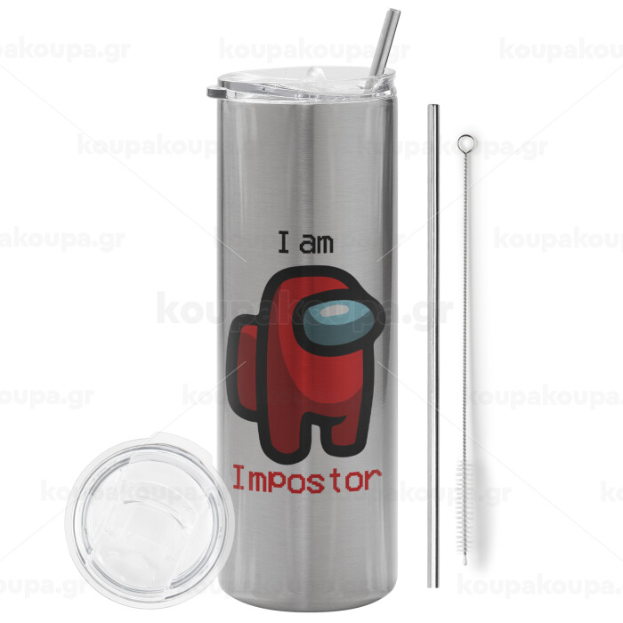 Among US i am impostor, Tumbler ποτήρι θερμό Ασημένιο από ανοξείδωτο ατσάλι 600ml, με μεταλλικό καλαμάκι & βούρτσα καθαρισμού