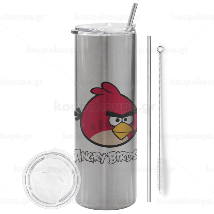 Angry birds Terence, Tumbler ποτήρι θερμό Ασημένιο από ανοξείδωτο ατσάλι 600ml, με μεταλλικό καλαμάκι & βούρτσα καθαρισμού