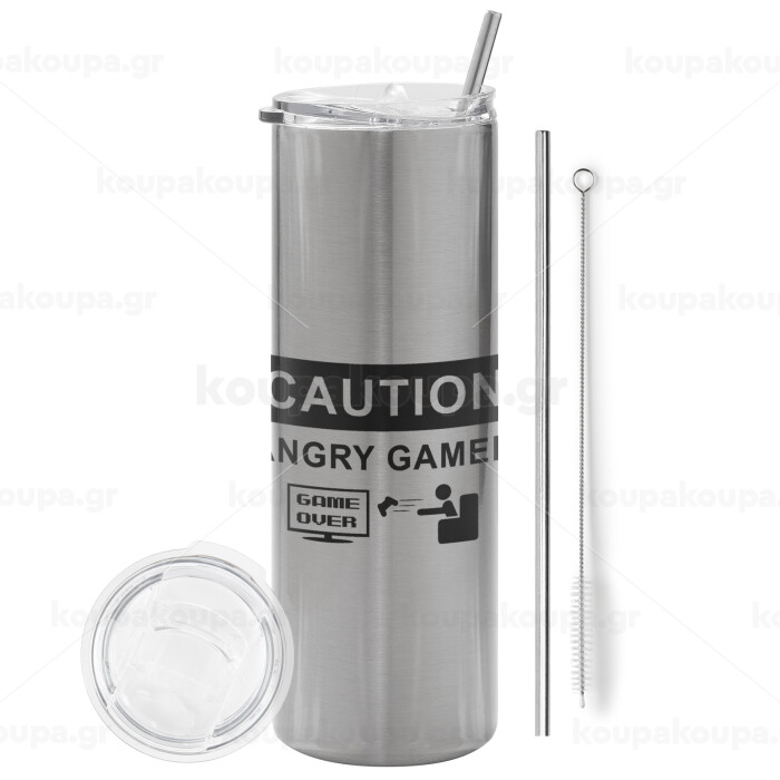 Caution, angry gamer!, Tumbler ποτήρι θερμό Ασημένιο από ανοξείδωτο ατσάλι 600ml, με μεταλλικό καλαμάκι & βούρτσα καθαρισμού
