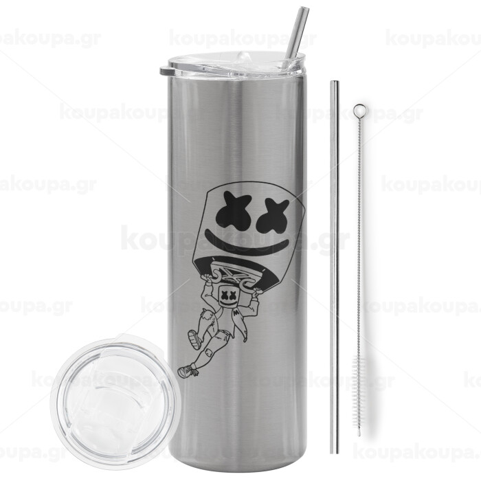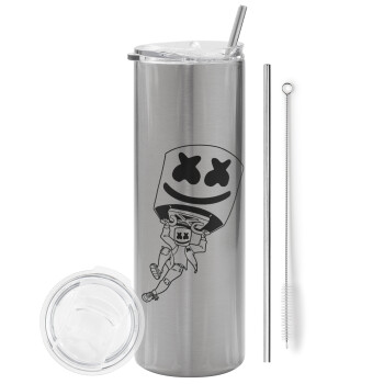 Fortnite Marshmello, Tumbler ποτήρι θερμό Ασημένιο από ανοξείδωτο ατσάλι 600ml, με μεταλλικό καλαμάκι & βούρτσα καθαρισμού