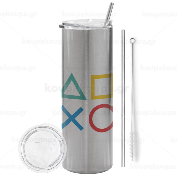 Gaming Symbols, Tumbler ποτήρι θερμό Ασημένιο από ανοξείδωτο ατσάλι 600ml, με μεταλλικό καλαμάκι & βούρτσα καθαρισμού