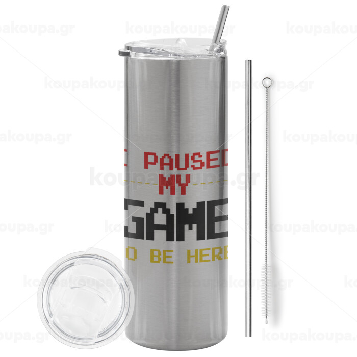 I paused my game to be here, Tumbler ποτήρι θερμό Ασημένιο από ανοξείδωτο ατσάλι 600ml, με μεταλλικό καλαμάκι & βούρτσα καθαρισμού