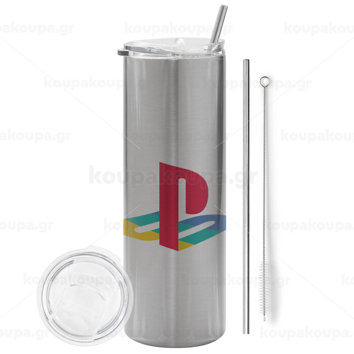 Playstation, Tumbler ποτήρι θερμό Ασημένιο από ανοξείδωτο ατσάλι 600ml, με μεταλλικό καλαμάκι & βούρτσα καθαρισμού