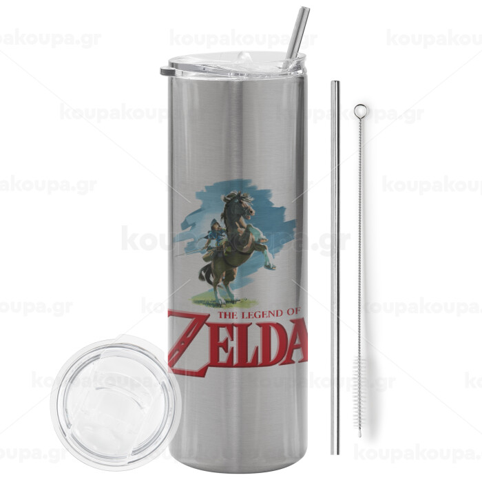 Zelda, Tumbler ποτήρι θερμό Ασημένιο από ανοξείδωτο ατσάλι 600ml, με μεταλλικό καλαμάκι & βούρτσα καθαρισμού