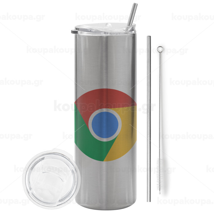 Chrome, Tumbler ποτήρι θερμό Ασημένιο από ανοξείδωτο ατσάλι 600ml, με μεταλλικό καλαμάκι & βούρτσα καθαρισμού