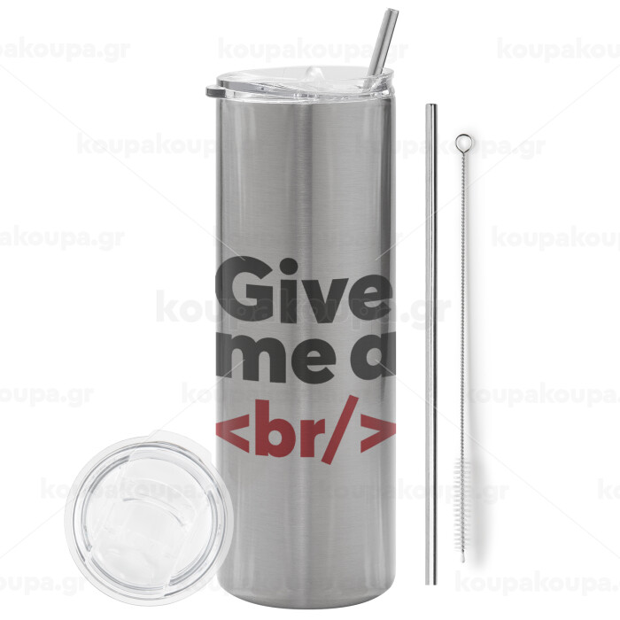 , Tumbler ποτήρι θερμό Ασημένιο από ανοξείδωτο ατσάλι 600ml, με μεταλλικό καλαμάκι & βούρτσα καθαρισμού