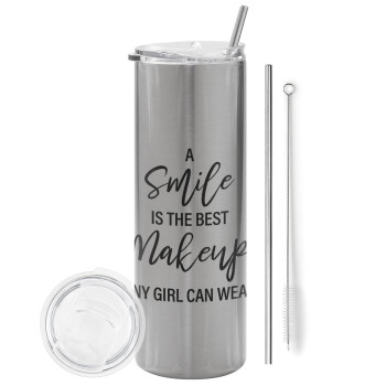 A slime is the best makeup any girl can wear, Tumbler ποτήρι θερμό Ασημένιο από ανοξείδωτο ατσάλι 600ml, με μεταλλικό καλαμάκι & βούρτσα καθαρισμού